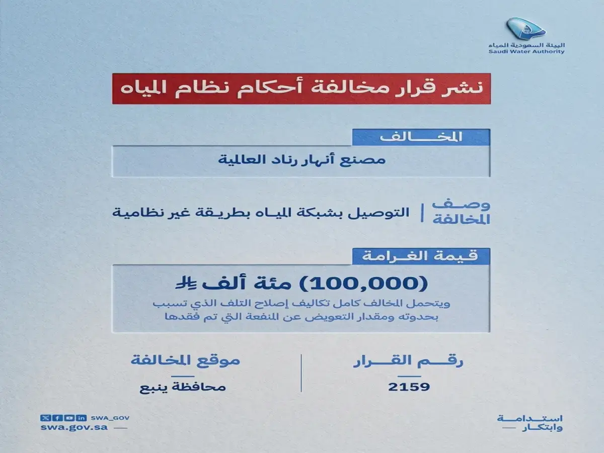 غرامة مالية تصل إلى 100,000 ريال فرضت على منشأة في محافظة ينبع، عقب ثبوت مخالفة نظامية في التعامل مع شبكة المياه، وفق ما كشفت عنه الهيئة السعودية للمياه.