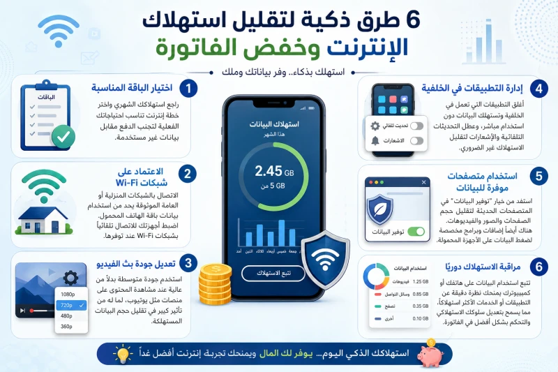 - الاعتماد على شبكات Wi-Fi: الاتصال بالشبكات المنزلية أو العامة الموثوقة يحد من استخدام بيانات باقة الهاتف المحمول. يجب ضبط الأجهزة للاتصال تلقائياً بشبكات Wi-Fi عند توفرها.